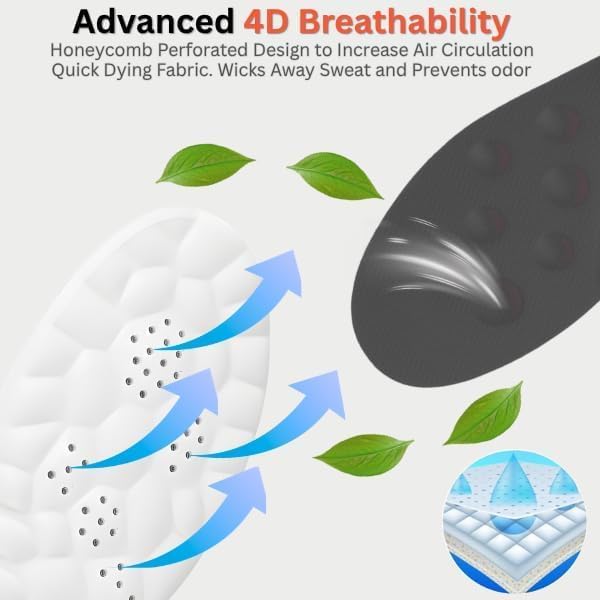 - BREATHABLE AND MOISTURE-WICKING: With a unique honeycomb perforated design, it ensures air circulation and remains breathable and moisture-wicking, shoe insoles men dries quickly with natural fabric with vent holes, leaving your feet feeling cool and dry all day long, and gel insoles mens is also odor-free to use.